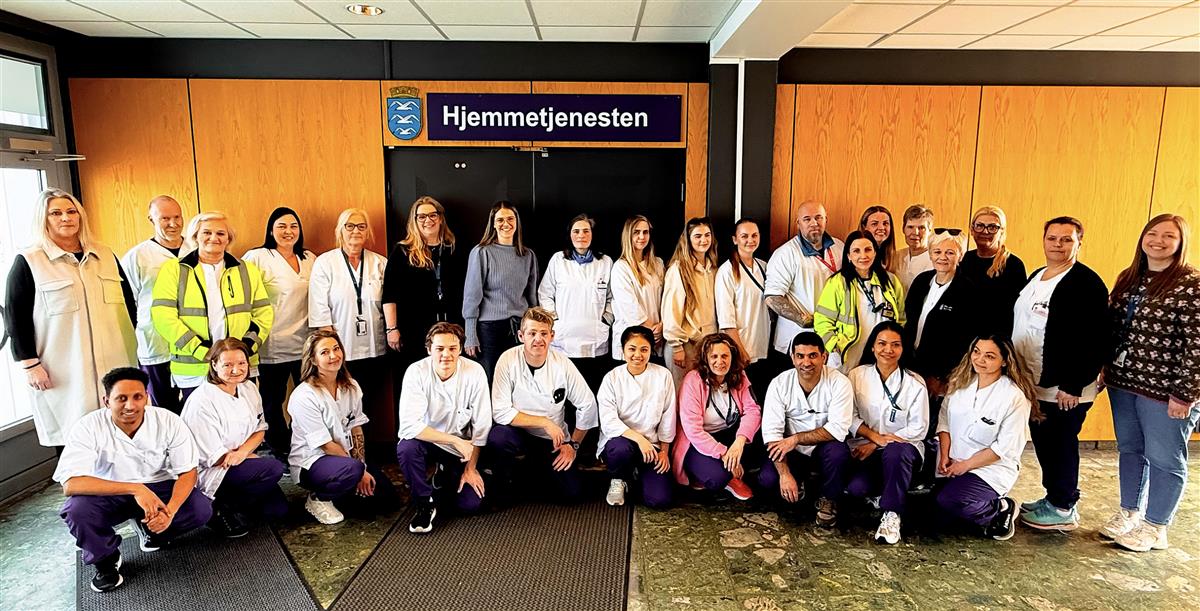 Ansatte i Hjemmetjenesten i Haugesund kommune er klare for omorganisering. Fra venstre bak: Linda Sakseid, Espen Gabrielsen, Bernadetta Zaremba, Cathrine Tangen, Else Njøs, virksomhetsleder Kathrine Straum, avdelingsleder Kathrine B. Grutle, Linda Helen Vangsnes, Elisa Bjørnø, Martha Mæland, Camilla Gravdal, Michael Sandvik, Siril Rosberg Hjelmen, avdelingsleder Maren Skjold, Tone Linner, Tove Kvia, Sonja Åsbø, Lisbeth Bangor og avdelingsleder Inger Marie Kallevik Nede fra venstre: Aman Aregay-Abadi , Henny Kristine Ytterøy, Sandra Vågen, Jakob Lillebråten, Marius Lindanger, Mai Ngoc Thi Anh , Astrid Høyvik, Arman Ibrahimi, Yuwathida Saimee og Maqleia Aaserød