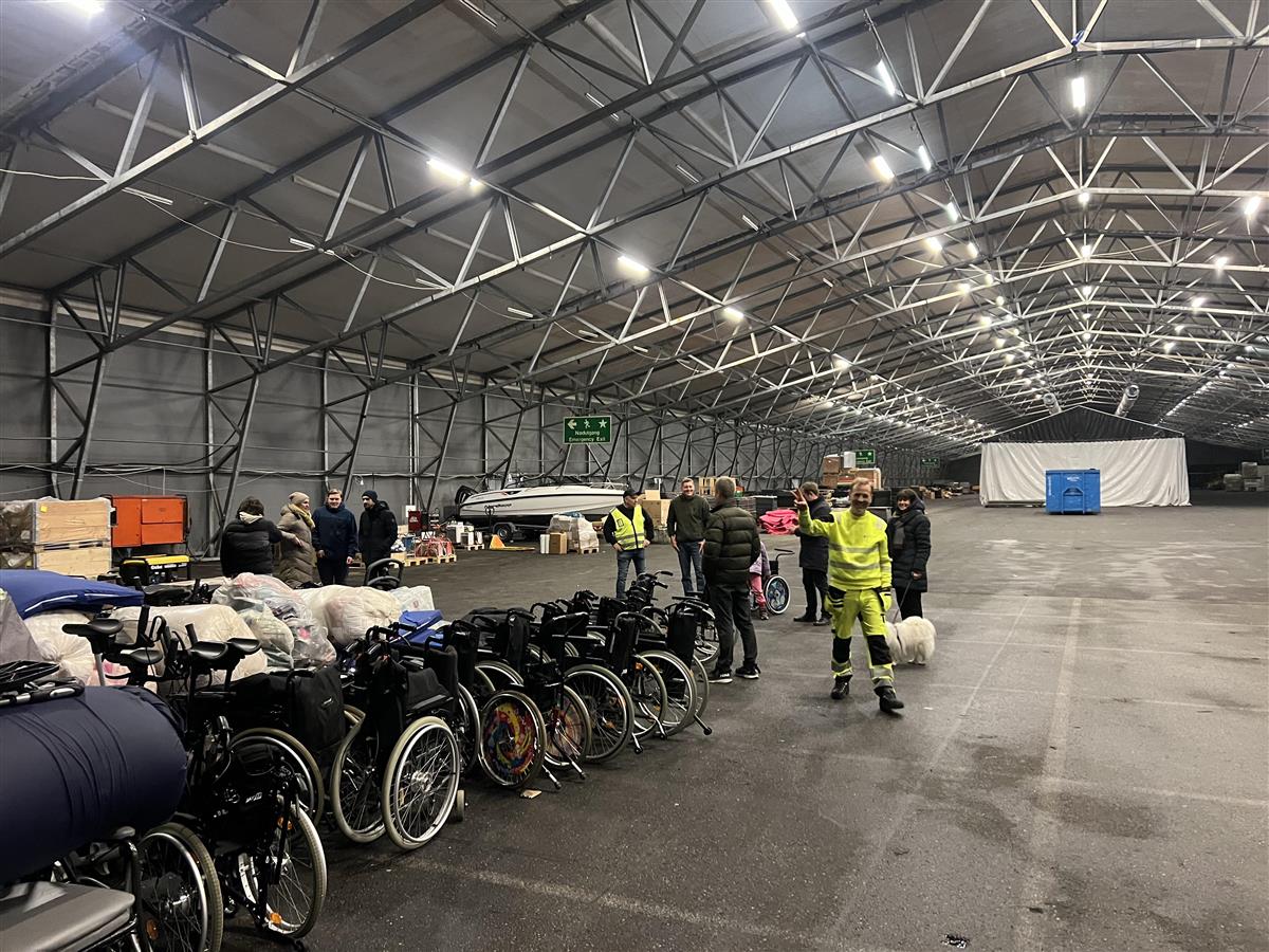 Noe av materiellet som ble samlet inn på Haugalandet og levert videre til Ukraina. Til høyre ordfører Nils Konrad Bua.