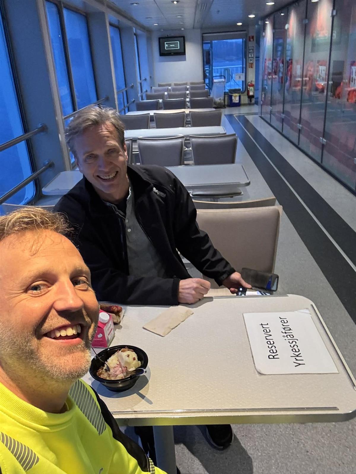 – Kjekt å kunne bidra i viktig dugnadsarbeid, sier Bua og Thorbjørnsen, som kunne lene seg tilbake og nyte turen over fjorden på ferja på de reserverte plassene for yrkessjåfører.